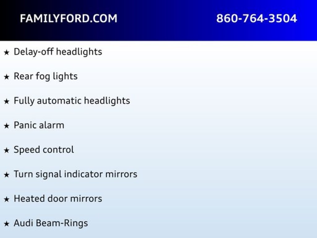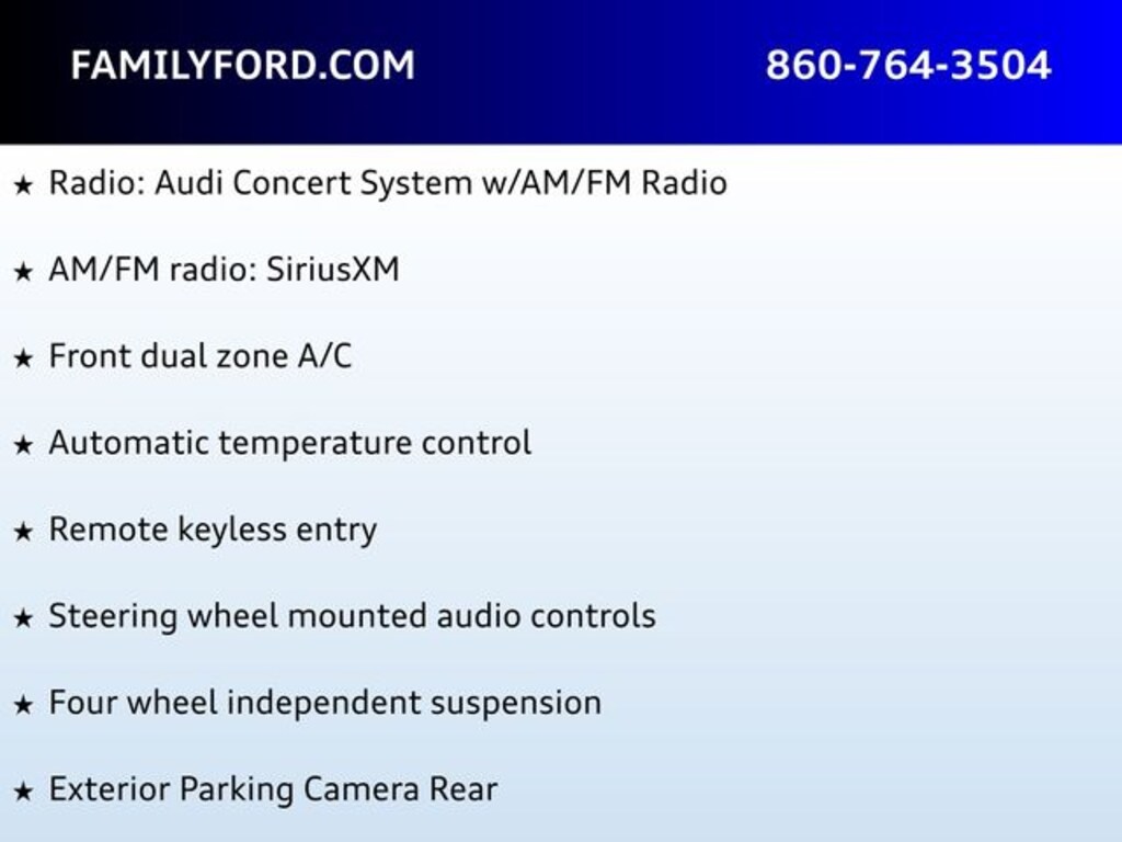 AM/FM radio: SiriusXM, Audi Beam-Rings, Automatic temperature control, Delay-off headlights, Exterior Parking Camera Rear, Four wheel independent suspension, Front dual zone A/C, Fully automatic headlights, Heated door mirrors, Heated front seats, Illuminated entry, Leather Seating Surfaces, Panic alarm, Power passenger seat, Radio: Audi Concert System w/AM/FM Radio, Rain sensing wipers, Rear fog lights, Remote keyless entry, Speed control, Steering wheel mounted audio controls, Turn signal indicator mirrors.