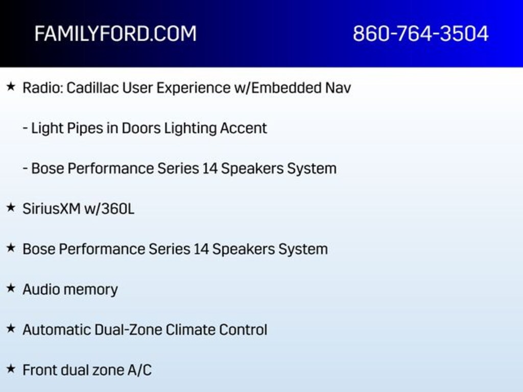 Technology: Cadillac User Experience with embedded navigation, Apple CarPlay & Android Auto, Bose Performance Series 14-speaker audio system, HD Rear Vision Camera, Dual Driver Info Center Display