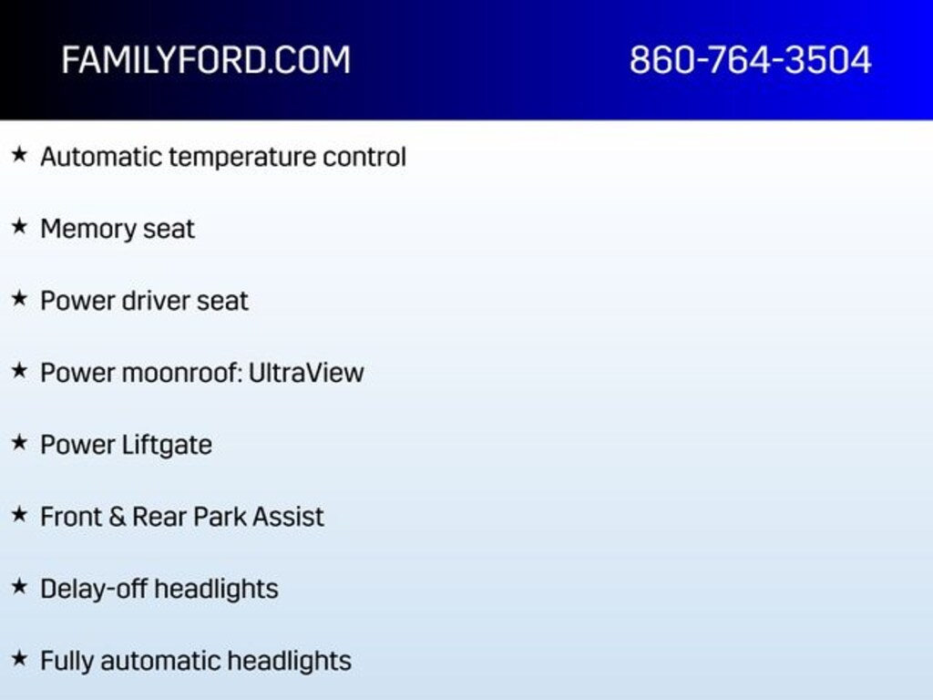 Comfort & Convenience: Heated front seats, heated steering wheel, leather seating surfaces with mini perforated inserts, memory seat, power driver & passenger seats, power liftgate, UltraView power moonroof