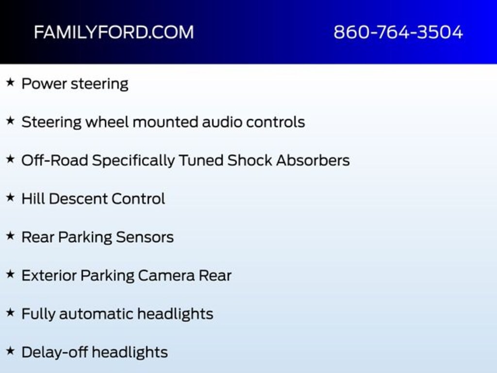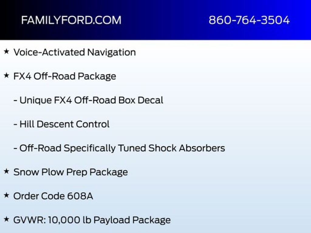 110V/400W Outlet, AM/FM radio: SiriusXM, AppLink/Apple CarPlay and Android Auto, Automatic temperature control, Delay-off headlights, Exterior Parking Camera Rear, Extra Extra Heavy-Duty Alternator (240 Amp), Front dual zone A/C, Fully automatic headlights, FX4 Off-Road Package, GVWR: 10,000 lb Payload Package, Heated door mirrors, Hill Descent Control, Leather steering wheel, LED Roof Clearance Lights, Memory Power-Adjustable Pedals, Off-Road Specifically Tuned Shock Absorbers, Order Code 608A, Panic alarm, Power door mirrors, Power driver seat, Power steering, Radio: B&O Sound System by Bang & Olufsen, Rear Parking Sensors, Security system, SiriusXM Radio, Snow Plow Prep Package, Speed control, Steering wheel mounted audio controls, SYNC 3 Communications & Entertainment System, Turn signal indicator mirrors, Unique FX4 Off-Road Box Decal, Upfitter Switches (6), Voice-Activated Navigation.