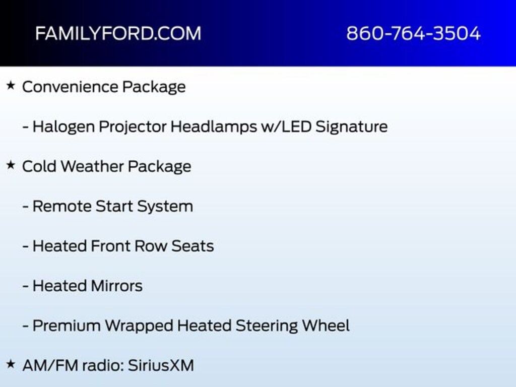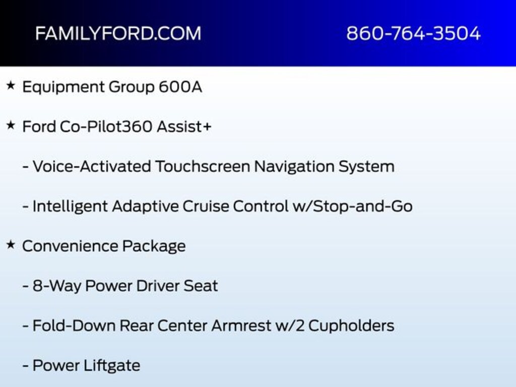 2.91 Axle Ratio, 8-Way Power Driver Seat, Air Conditioning, AM/FM radio: SiriusXM, Auto High-beam Headlights, Automatic temperature control, Cold Weather Package, Convenience Package, Delay-off headlights, Equipment Group 600A, Exterior Parking Camera Rear, Fold-Down Rear Center Armrest w/2 Cupholders, Ford Co-Pilot360 Assist+, Front dual zone A/C, Fully automatic headlights, Halogen Projector Headlamps w/LED Signature, Heated Front Row Seats, Heated Mirrors, Illuminated entry, Intelligent Adaptive Cruise Control w/Stop-and-Go, Panic alarm, Power door mirrors, Power Liftgate, Premium Wrapped Heated Steering Wheel, Remote Start System, Speed-Sensitive Wipers, Unique Cloth Front Bucket Seats, Voice-Activated Touchscreen Navigation System, Wheels: 18" Machined-Face Ebony-Painted Aluminum.