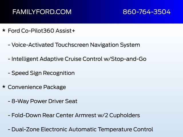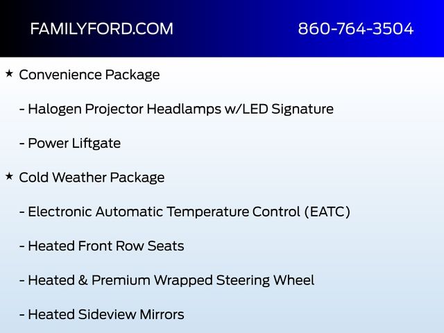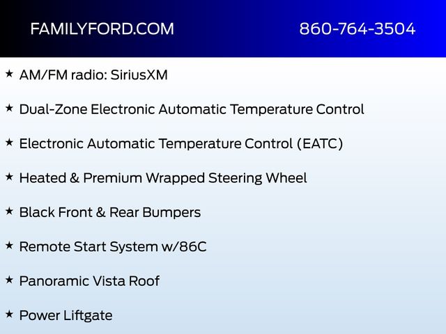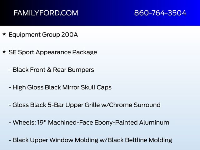 8-Way Power Driver Seat, AM/FM radio: SiriusXM, Auto High-beam Headlights, Black Front & Rear Bumpers, Black Roof-Rack Side Rails, Black Upper Window Molding w/Black Beltline Molding, Cold Weather Package, Convenience Package, Dual-Zone Electronic Automatic Temperature Control, Electronic Automatic Temperature Control (EATC), Equipment Group 200A, Exterior Parking Camera Rear, Fold-Down Rear Center Armrest w/2 Cupholders, Ford Co-Pilot360 Assist+, Fully automatic headlights, Gloss Black 5-Bar Upper Grille w/Chrome Surround, Halogen Projector Headlamps w/LED Signature, Heated & Premium Wrapped Steering Wheel, Heated Front Row Seats, Heated Sideview Mirrors, High Gloss Black Mirror Skull Caps, Illuminated entry, Intelligent Adaptive Cruise Control w/Stop-and-Go, Panic alarm, Panoramic Vista Roof, Power Liftgate, Remote Start System w/86C, SE Sport Appearance Package, Speed Sign Recognition, Speed-Sensitive Wipers, Voice-Activated Touchscreen Navigation System, Wheels: 19" Machined-Face Ebony-Painted Aluminum.