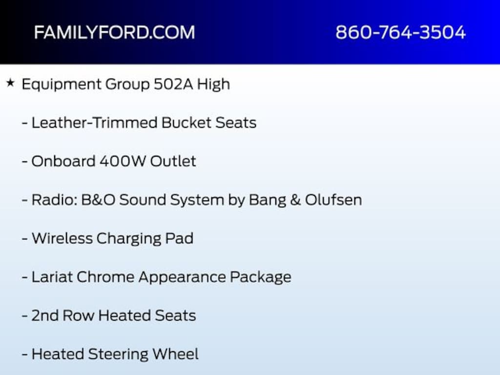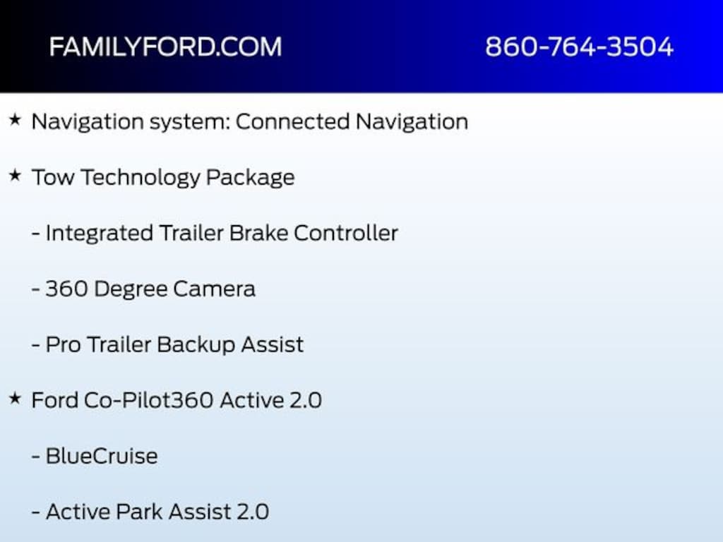 Technology & Connectivity: SYNC 4, BlueCruise hands-free driving, Ford Co-Pilot360 Active 2.0, Active Park Assist 2.0, Connected Navigation, wireless charging pad