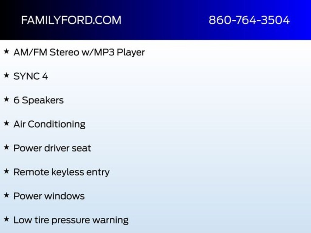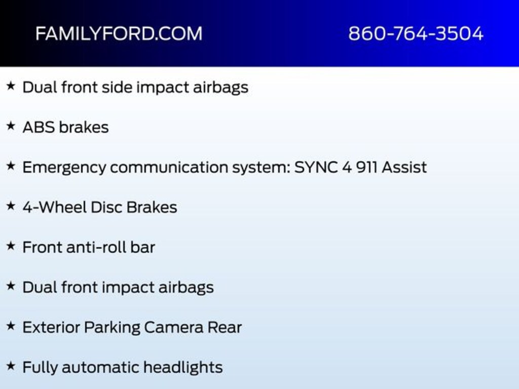 190 Amp Alternator, 4-Wheel Disc Brakes, 6 Speakers, ABS brakes, Air Conditioning, AM/FM Stereo w/MP3 Player, Auto High-beam Headlights, Dual front impact airbags, Dual front side impact airbags, Electronic-Locking w/3.73 Axle Ratio, Emergency communication system: SYNC 4 911 Assist, Exterior Parking Camera Rear, Front anti-roll bar, Fully automatic headlights, Heated door mirrors, Illuminated entry, Low tire pressure warning, Power door mirrors, Power driver seat, Power windows, Privacy Glass, Rear step bumper, Remote keyless entry, Speed control, SYNC 4, Turn signal indicator mirrors, Wheels: 18" Sparkle Silver Painted Cast Aluminum.