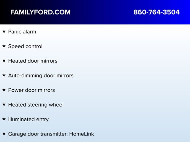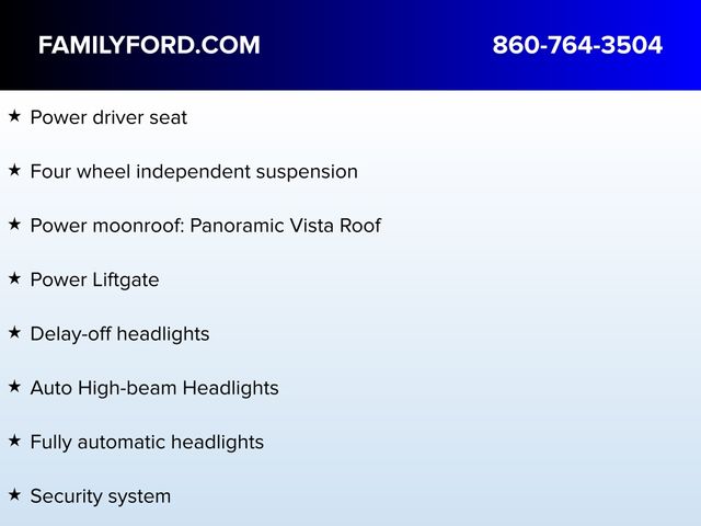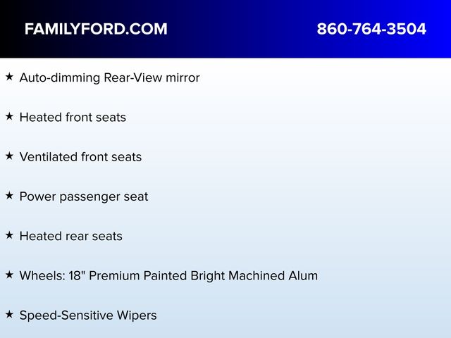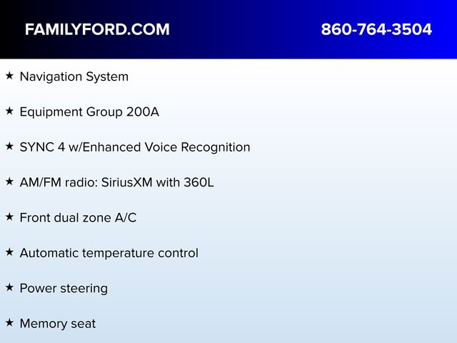 AM/FM radio: SiriusXM with 360L, Auto High-beam Headlights, Auto-dimming door mirrors, Auto-dimming Rear-View mirror, Automatic temperature control, Delay-off headlights, Equipment Group 200A, Four wheel independent suspension, Front dual zone A/C, Fully automatic headlights, Garage door transmitter: HomeLink, Heated door mirrors, Heated front seats, Heated rear seats, Heated steering wheel, Illuminated entry, Memory seat, Navigation System, Panic alarm, Power door mirrors, Power driver seat, Power Liftgate, Power moonroof: Panoramic Vista Roof, Power passenger seat, Power steering, Security system, Speed control, Speed-Sensitive Wipers, SYNC 4 w/Enhanced Voice Recognition, Ventilated front seats, Wheels: 18" Premium Painted Bright Machined Alum.