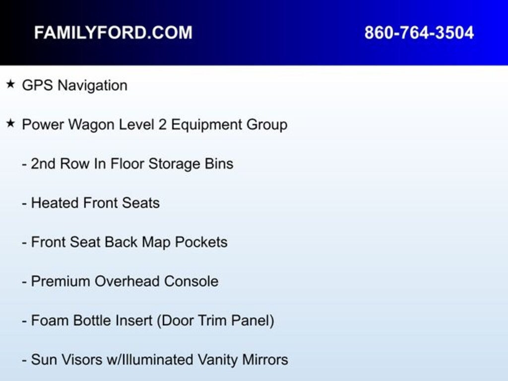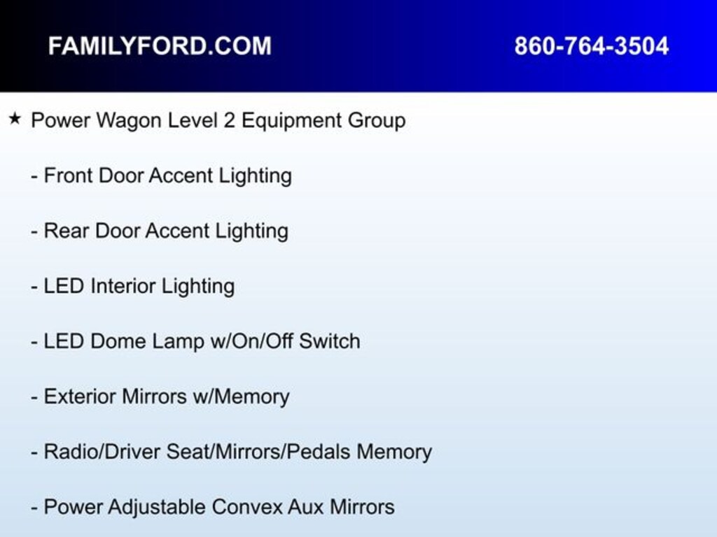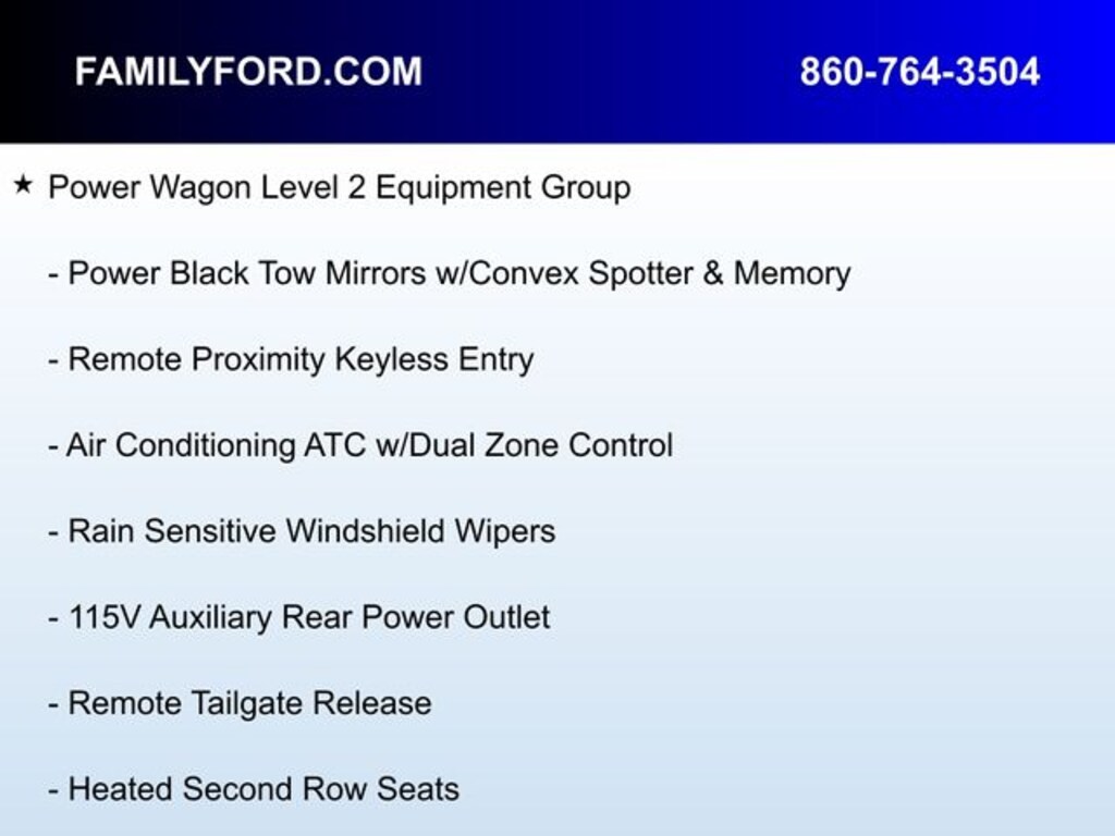 #1 Seat Foam Cushion, 1-Year SiriusXM Guardian Trial, 115V Auxiliary Rear Power Outlet, 12" Touchscreen Display, 2 Way Rear Headrest Seat, 2nd Row In Floor Storage Bins, 4 Way Front Headrests, 40/20/40 Split Bench Seat, 4G LTE Wi-Fi Hot Spot, 5-Year SiriusXM Traffic Service, 5-Year SiriusXM Travel Link Service, 9 Alpine Speakers w/Subwoofer, Air Conditioning ATC w/Dual Zone Control, Apple CarPlay, Auto High Beam Headlamp Control, Body Color Door Handles, CTR Stop Lamp w/Cargo View Camera, Delay-off headlights, Disassociated Touchscreen Display, Exterior Mirrors w/Memory, Foam Bottle Insert (Door Trim Panel), Folding Flat Load Floor Storage, For Details Visit DriveUconnect.com, Front Armrest w/Cupholders, Front Center Seat Cushion Storage, Front Door Accent Lighting, Front Seat Back Map Pockets, Fully automatic headlights, Google Android Auto, GPS Antenna Input, GPS Navigation, HD Radio, Heated door mirrors, Heated Front Seats, Heated Second Row Seats, Heated Steering Wheel, High Back Seats, Integrated Voice Command w/Bluetooth, Leather Trim 40/20/40 Bench Seat, LED Dome Lamp w/On/Off Switch, LED Interior Lighting, Media Hub w/2 Charge Only USBs, Mirror-Mounted Aux Reverse Lamps, Off-Road Information Pages, Overhead LED Lamps, ParkView Rear Back-Up Camera, Power 2-Way Driver Lumbar Adjust, Power 2-Way Passenger Lumbar Adjust, Power Adjust 8-Way Front Passenger Seat, Power Adjustable Convex Aux Mirrors, Power Adjustable Pedals w/Memory, Power Black Tow Mirrors w/Convex Spotter & Memory, Power driver seat, Power Sunroof, Power Wagon Level 2 Equipment Group, Premium Overhead Console, Radio: Uconnect 12.0 w/Navigation, Radio/Driver Seat/Mirrors/Pedals Memory, Rain sensing wipers, Rain Sensitive Windshield Wipers, Rear 60/40 Folding Seat, Rear Door Accent Lighting, Remote Proximity Keyless Entry, Remote Start System, Remote Tailgate Release, Security Alarm, SiriusXM Satellite Radio, SiriusXM Traffic Plus, SiriusXM Travel Link, SiriusXM w/360L, Sun Visors w/Illuminated Vanity Mirrors, Surround View Camera System, Towing Technology Group, Trailer Reverse Guidance, Universal Garage Door Opener, Ventilated Front Seats, Wheels: 17" x 8.0" Matte Black/Diamond Cut.