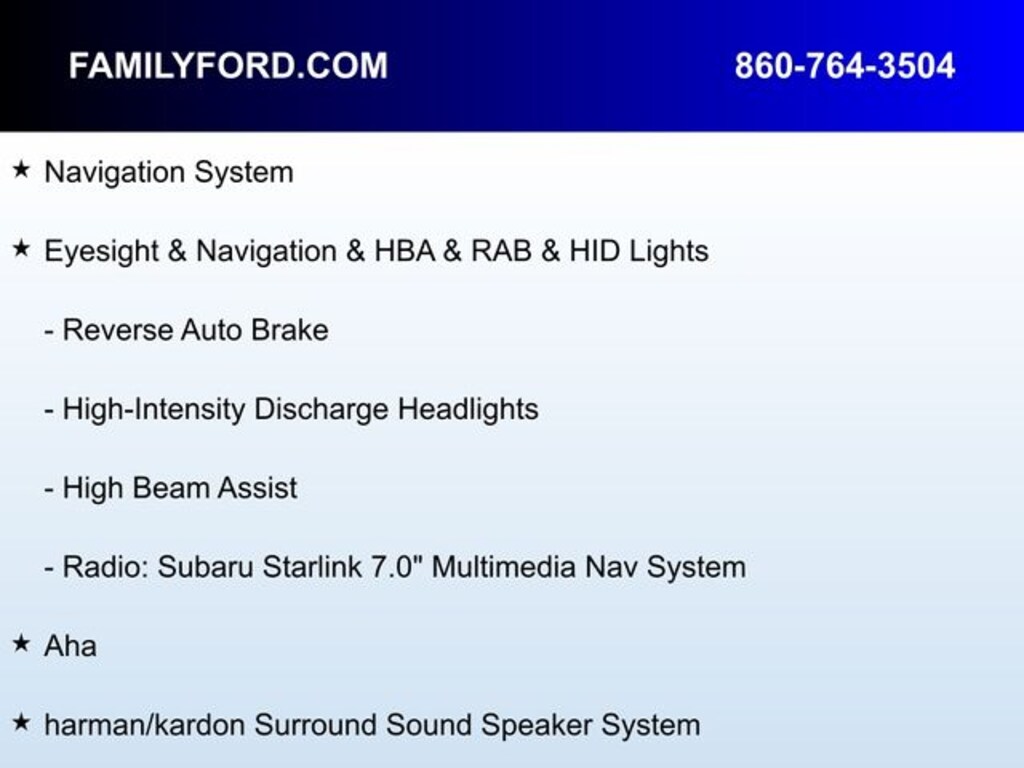 Aha, Exterior Parking Camera Rear, Eyesight & Navigation & HBA & RAB & HID Lights, harman/kardon Surround Sound Speaker System, Heated front seats, Heated rear seats, Heated Reclining Front Bucket Seats, High Beam Assist, High-Intensity Discharge Headlights, Lane Departure Warning System, Memory seat, Navigation System, Power driver seat, Power Liftgate, Power moonroof, Power windows, Pre-Collision System, Radio: Subaru Starlink 7.0" Multimedia Nav System, Remote keyless entry, Reverse Auto Brake, Smartphone Integration, Speed control, Speed-sensing steering, Traction control, Vehicle Information Display.