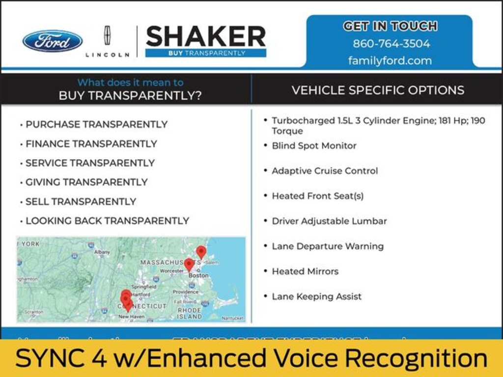 Air Conditioning, AM/FM radio: SiriusXM, Auto High-beam Headlights, Cloth w/Easy-to-Clean Front Bucket Seats, Convenience Package, Equipment Group 200A, Four wheel independent suspension, Front Driver/Passenger Seat Back Map Pockets, Fully automatic headlights, Heated 8-Way Power Driver's Seat, Heated door mirrors, Illuminated entry, LED Fog Lamps, Power door mirrors, Premium Wrapped Steering Wheel, Rear Parking Sensors, Security system, SiriusXM, Speed control, Speed-sensing steering, Speed-Sensitive Wipers, Split folding rear seat, SYNC 4 w/Enhanced Voice Recognition, Traction control, Universal Garage Door Opener (UGDO), Wheels: 17" Carbonized Gray-Painted Aluminum.