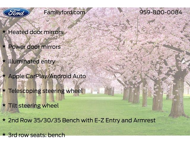 2nd Row 35/30/35 Bench with E-Z Entry and Armrest, 3rd row seats: bench, AM/FM radio: SiriusXM with 360L, Apple CarPlay/Android Auto, Auto High-beam Headlights, Automatic temperature control, Delay-off headlights, Exterior Parking Camera Rear, Ford Connectivity Package (one-Time Purchase - 7 Years), Front dual zone A/C, Fully automatic headlights, Heated door mirrors, Illuminated entry, Panic alarm, Power door mirrors, Power driver seat, Rear air conditioning, Rear window defroster, Remote keyless entry, Security system, Speed control, Speed-Sensitive Wipers, Steering wheel mounted audio controls, Telescoping steering wheel, Tilt steering wheel, Wheels: 18" Sparkle Silver-Painted Aluminum.