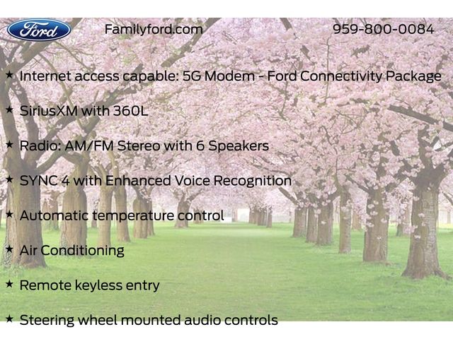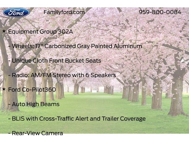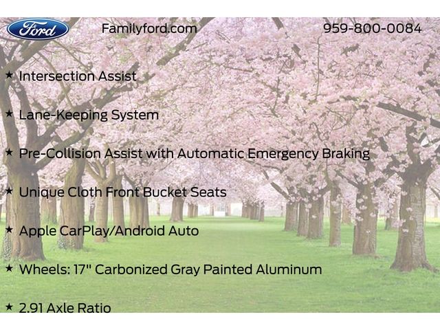 2.91 Axle Ratio, Air Conditioning, Apple CarPlay/Android Auto, Auto High Beams, Automatic temperature control, BLIS with Cross-Traffic Alert and Trailer Coverage, Equipment Group 302A, Exit Warning, Ford Co-Pilot360, Ford Connectivity Package (1-Year Included), Internet access capable: 5G Modem - Ford Connectivity Package, Intersection Assist, Lane-Keeping System, Power door mirrors, Power Glass Manual-Folding Mirrors, Pre-Collision Assist with Automatic Emergency Braking, Radio: AM/FM Stereo with 6 Speakers, Rear Cross Traffic Braking, Rear Parking Sensors, Rear-View Camera, Remote keyless entry, SiriusXM with 360L, Steering wheel mounted audio controls, SYNC 4 with Enhanced Voice Recognition, Unique Cloth Front Bucket Seats, Wheels: 17" Carbonized Gray Painted Aluminum.