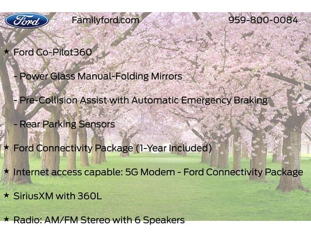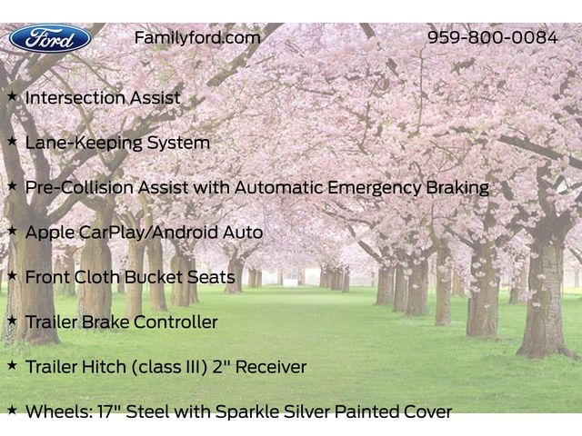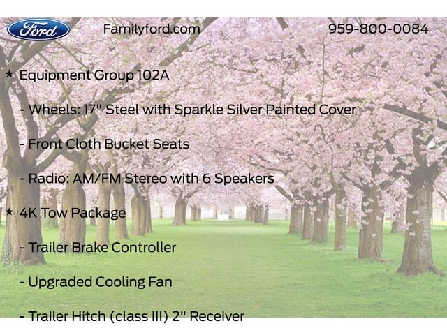 4K Tow Package, Apple CarPlay/Android Auto, Auto High Beams, Auto High-beam Headlights, Automatic temperature control, BLIS with Cross-Traffic Alert and Trailer Coverage, Delay-off headlights, Equipment Group 102A, Exit Warning, Ford Co-Pilot360, Ford Connectivity Package (1-Year Included), Front Cloth Bucket Seats, Fully automatic headlights, Internet access capable: 5G Modem - Ford Connectivity Package, Intersection Assist, Lane-Keeping System, Panic alarm, Power Glass Manual-Folding Mirrors, Pre-Collision Assist with Automatic Emergency Braking, Radio: AM/FM Stereo with 6 Speakers, Rear Cross Traffic Braking, Rear Parking Sensors, Rear-View Camera, Remote keyless entry, SiriusXM with 360L, Speed control, Steering wheel mounted audio controls, SYNC 4 with Enhanced Voice Recognition, Trailer Brake Controller, Trailer Hitch (class III) 2" Receiver, Upgraded Cooling Fan, Wheels: 17" Steel with Sparkle Silver Painted Cover.