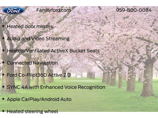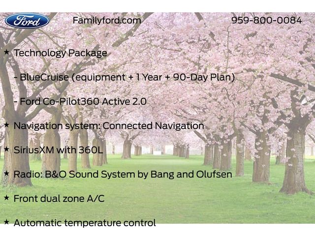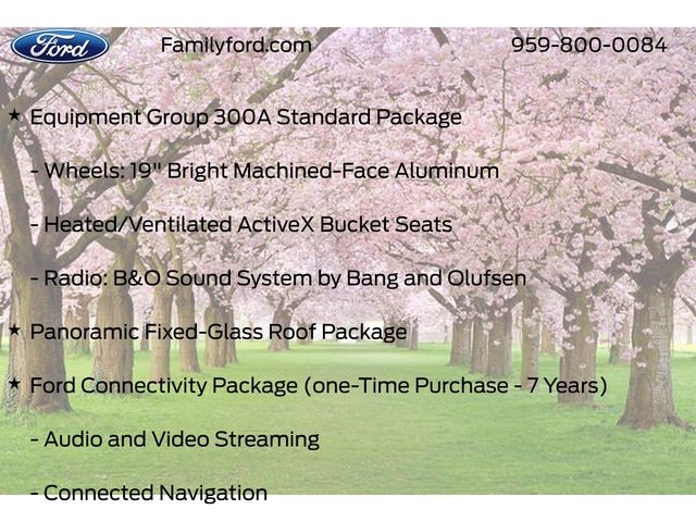 Air Conditioning, Apple CarPlay/Android Auto, Audio and Video Streaming, Auto High-beam Headlights, Automatic temperature control, Blue Cruise (equipment + 1 Year + 90-Day Plan), Connected Navigation, Delay-off headlights, Drainable Frunk, Equipment Group 300A Standard Package, Exterior Parking Camera Rear, Ford Co-Pilot360 Active 2.0, Ford Connectivity Package (one-Time Purchase - 7 Years), Front dual zone A/C, Fully automatic headlights, Heated door mirrors, Heated front seats, Heated steering wheel, Heated/Ventilated ActiveX Bucket Seats, Memory seat, Mobile Power Cord (120V/240V), NACS Fast Charging Adapter, Navigation system: Connected Navigation, Panic alarm, Panoramic Fixed-Glass Roof Package, Power door mirrors, Power driver seat, Power passenger seat, Radio: B&O Sound System by Bang and Olufsen, Rain sensing wipers, Remote keyless entry, Security system, SiriusXM with 360L, Speed-Sensitive Wipers, Steering wheel mounted audio controls, SYNC 4A with Enhanced Voice Recognition, Technology Package, Ventilated front seats, Wheels: 19" Bright Machined-Face Aluminum.