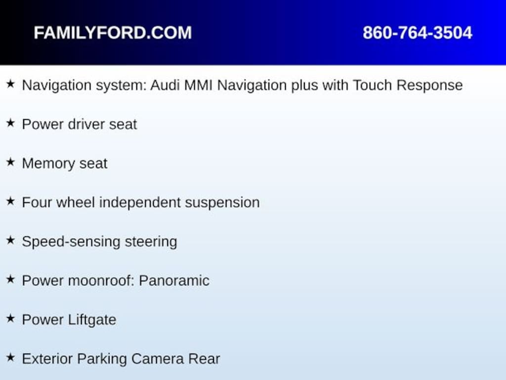 3rd row seats: bench, Auto High-beam Headlights, Auto-dimming door mirrors, Auto-dimming Rear-View mirror, Delay-off headlights, Exterior Parking Camera Rear, Four wheel independent suspension, Fully automatic headlights, Genuine wood door panel insert, Heated door mirrors, Heated Front Bucket Seats, Heated front seats, Illuminated entry, Leather steering wheel, Memory seat, Navigation system: Audi MMI Navigation plus with Touch Response, Power door mirrors, Power driver seat, Power Liftgate, Power moonroof: Panoramic, Power passenger seat, Rain sensing wipers, Rear window wiper, Reclining 3rd row seat, Security system, Speed control, Speed-sensing steering, Turn signal indicator mirrors, Variably intermittent wipers, Wheels: 19" 5-Arm-Star Design.