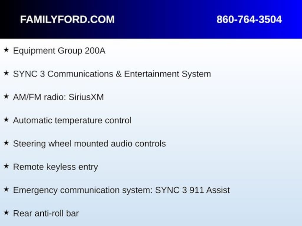 3.80 Axle Ratio, AM/FM radio: SiriusXM, Auto High-beam Headlights, Automatic temperature control, Delay-off headlights, Emergency communication system: SYNC 3 911 Assist, Equipment Group 200A, Fully automatic headlights, Heated door mirrors, Illuminated entry, Panic alarm, Power door mirrors, Rear anti-roll bar, Remote keyless entry, Security system, Speed control, Speed-Sensitive Wipers, Steering wheel mounted audio controls, SYNC 3 Communications & Entertainment System, Tilt steering wheel, Trip computer, Unique Cloth Front Bucket Seats, Wheels: 17" Carbonized Gray-Painted Aluminum.