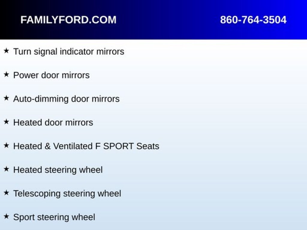 19" Split 5-Spoke Alloy Wheels, Air Conditioning, AM/FM radio: SiriusXM, Auto High-beam Headlights, Auto-dimming door mirrors, Automatic temperature control, Delay-off headlights, Exterior Parking Camera Rear, Front dual zone A/C, Fully automatic headlights, Garage door transmitter: HomeLink, Heated & Ventilated F SPORT Seats, Heated door mirrors, Heated front seats, Heated steering wheel, Memory seat, Panic alarm, Perforated NuLuxe Seat Trim, Power door mirrors, Power driver seat, Power passenger seat, Radio: Multimedia System w/8" Color Touchscreen, Rain sensing wipers, Security system, Speed control, Speed-Sensitive Wipers, Sport steering wheel, Steering wheel memory, Steering wheel mounted audio controls, Telescoping steering wheel, Turn signal indicator mirrors, Ventilated front seats.