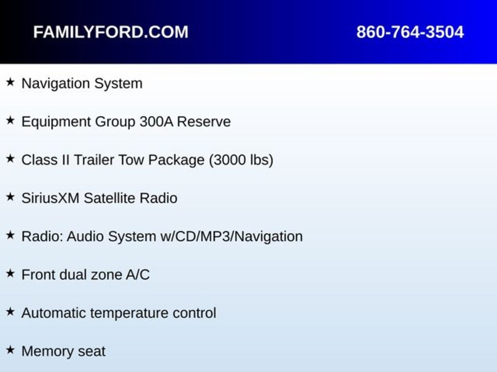 Adaptive suspension, Auto-dimming Rear-View mirror, Automatic temperature control, Class II Trailer Tow Package (3000 lbs), Delay-off headlights, Equipment Group 300A Reserve, Exterior Parking Camera Rear, Front dual zone A/C, Fully automatic headlights, Heated door mirrors, Heated front seats, High-Intensity Discharge Headlights, Illuminated entry, Memory seat, Navigation System, Panic alarm, Power door mirrors, Power driver seat, Power Liftgate, Power moonroof, Power passenger seat, Radio: Audio System w/CD/MP3/Navigation, Rear Parking Sensors, Remote keyless entry, Security system, SiriusXM Satellite Radio, Speed control, Speed-Sensitive Wipers, Steering wheel memory, Steering wheel mounted audio controls, SYNC 3 Communications & Entertainment System, Ventilated front seats, Wheels: 19" Premium Painted 5-Spoke Aluminum.