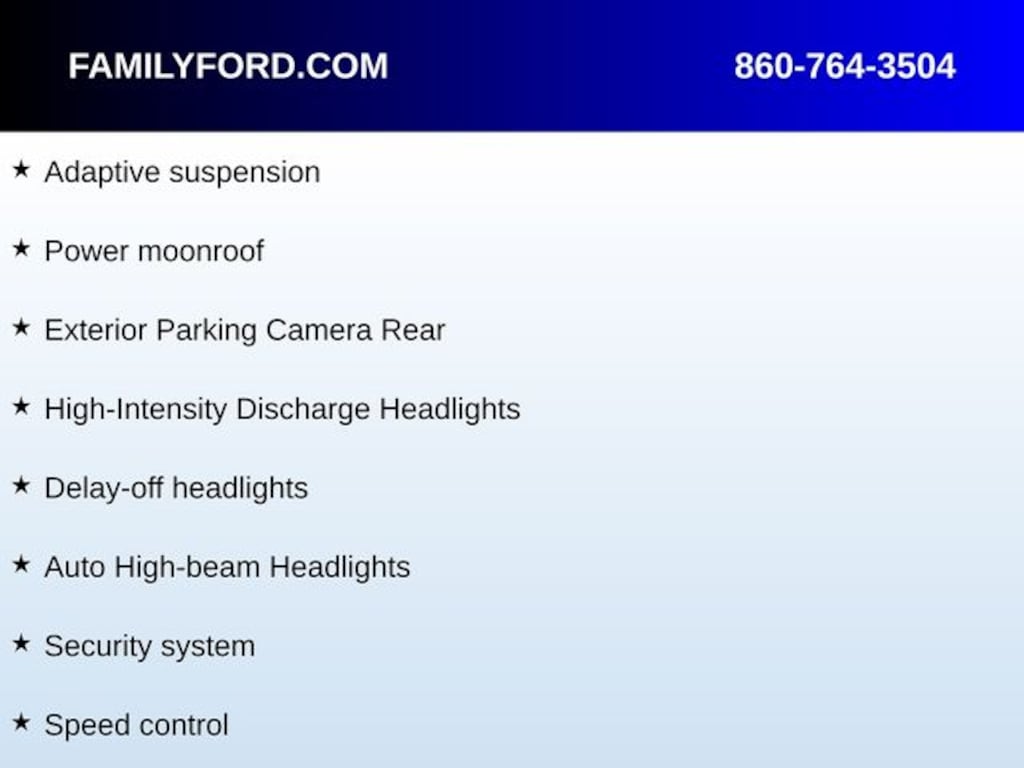 Adaptive suspension, AM/FM radio: SiriusXM, AppLink/Apple CarPlay and Android Auto, Auto High-beam Headlights, Auto-dimming door mirrors, Delay-off headlights, Equipment Group 300A, Exterior Parking Camera Rear, Front dual zone A/C, Garage door transmitter, Heated door mirrors, Heated front seats, Heated rear seats, Heated steering wheel, High-Intensity Discharge Headlights, Illuminated entry, Memory seat, Navigation System, Power door mirrors, Power driver seat, Power moonroof, Power passenger seat, Radio: Revel Audio System w/Single CD & HD Radio, Rain sensing wipers, Security system, Speed control, Speed-Sensitive Wipers, Steering wheel mounted audio controls, SYNC 3, Ventilated front seats, Wheels: 19" Satin Finished 7-Spoke Machined Alum.