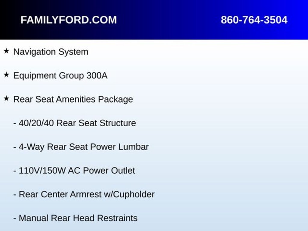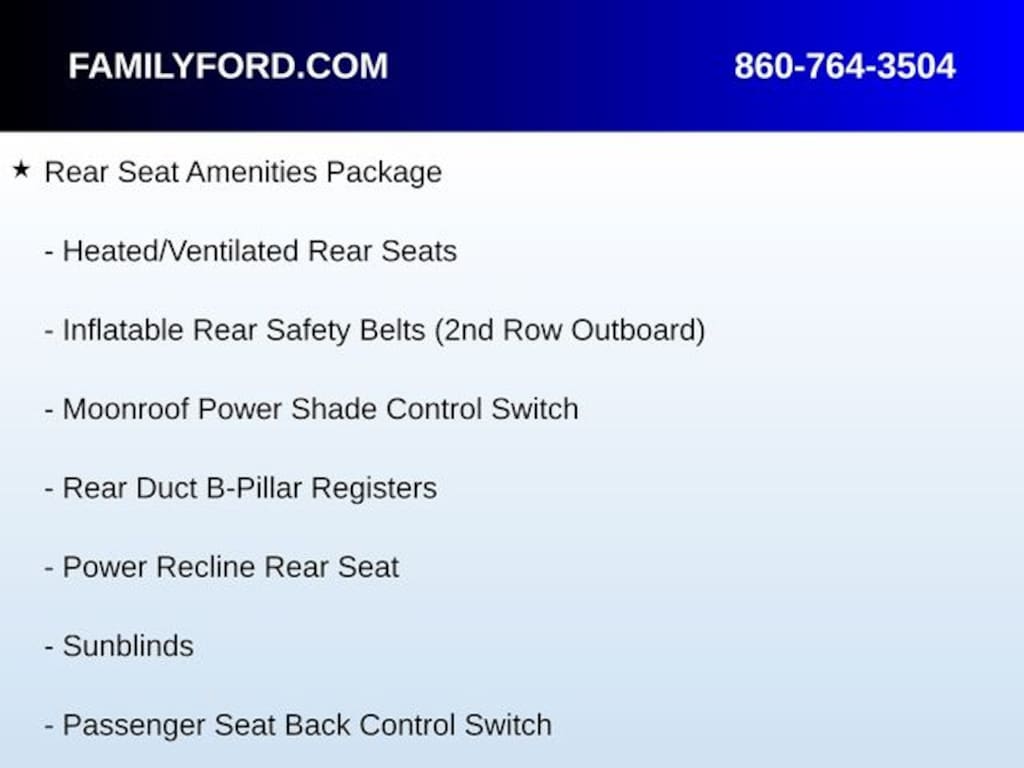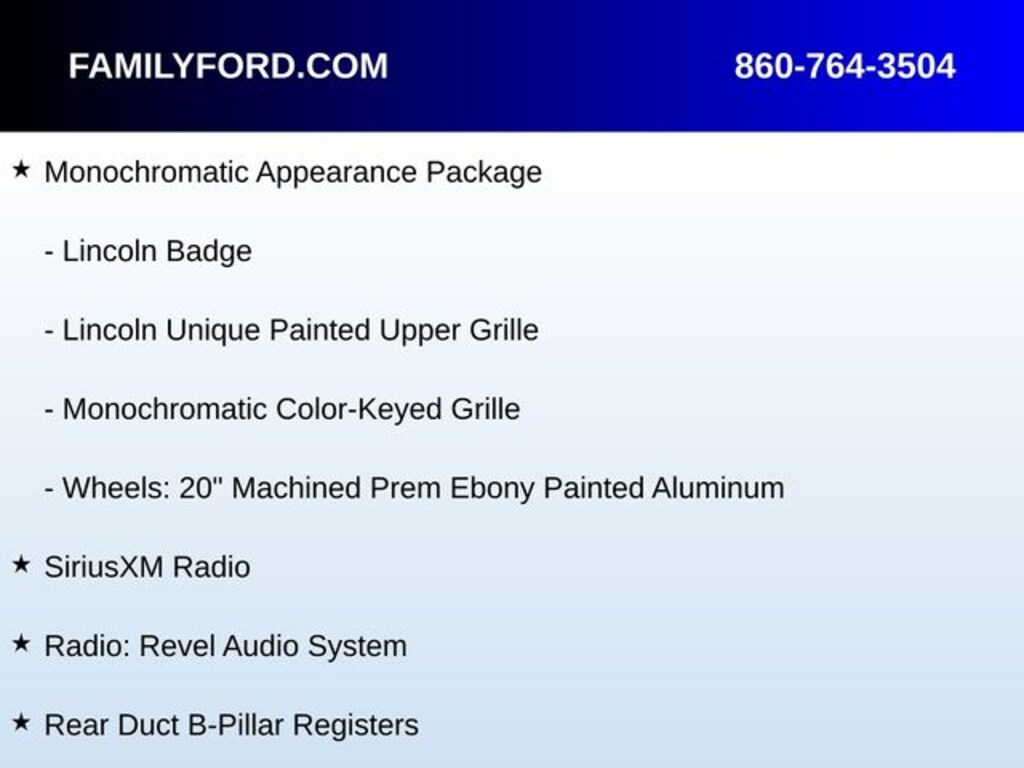 110V/150W AC Power Outlet, 4-Way Rear Seat Power Lumbar, 40/20/40 Rear Seat Structure, Auto High-beam Headlights, Automatic temperature control, Delay-off headlights, Equipment Group 300A, Front dual zone A/C, Fully automatic headlights, Garage door transmitter, Heads-Up Display, Heated door mirrors, Heated steering wheel, Heated/Ventilated Rear Seats, High-Intensity Discharge Headlights, Illuminated entry, Inflatable Rear Safety Belts (2nd Row Outboard), Lincoln Badge, Lincoln Unique Painted Upper Grille, Manual Rear Head Restraints, Memory seat, Monochromatic Appearance Package, Monochromatic Color-Keyed Grille, Moonroof Power Shade Control Switch, Navigation System, Panic alarm, Passenger Seat Back Control Switch, Power door mirrors, Power driver seat, Power Recline Rear Seat, Radio: Revel Audio System, Rain sensing wipers, Rear Center Armrest w/Cupholder, Rear Duct B-Pillar Registers, Rear Seat Amenities Package, Security system, SiriusXM Radio, Speed control, Steering wheel mounted A/C controls, Steering wheel mounted audio controls, Sunblinds, SYNC 3 Communications & Entertainment System, Ventilated front seats, Voice-Activated Touchscreen Navigation System, Wheels: 20" Machined Prem Ebony Painted Aluminum.