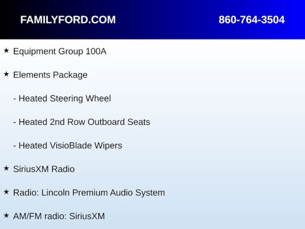 AM/FM radio: SiriusXM, Auto High-beam Headlights, Automatic temperature control, Delay-off headlights, Elements Package, Equipment Group 100A, Front dual zone A/C, Fully automatic headlights, Garage door transmitter, Heated 2nd Row Outboard Seats, Heated door mirrors, Heated Steering Wheel, Heated VisioBlade Wipers, HVAC memory, Illuminated entry, Memory seat, Panic alarm, Power door mirrors, Power driver seat, Power Liftgate, Power passenger seat, Radio: Lincoln Premium Audio System, Security system, SiriusXM Radio, Speed control, Speed-Sensitive Wipers, Steering wheel mounted A/C controls, SYNC 3 Communication & Entertainment System, Turn signal indicator mirrors, Wheels: 19" Bright-Machined Aluminum.