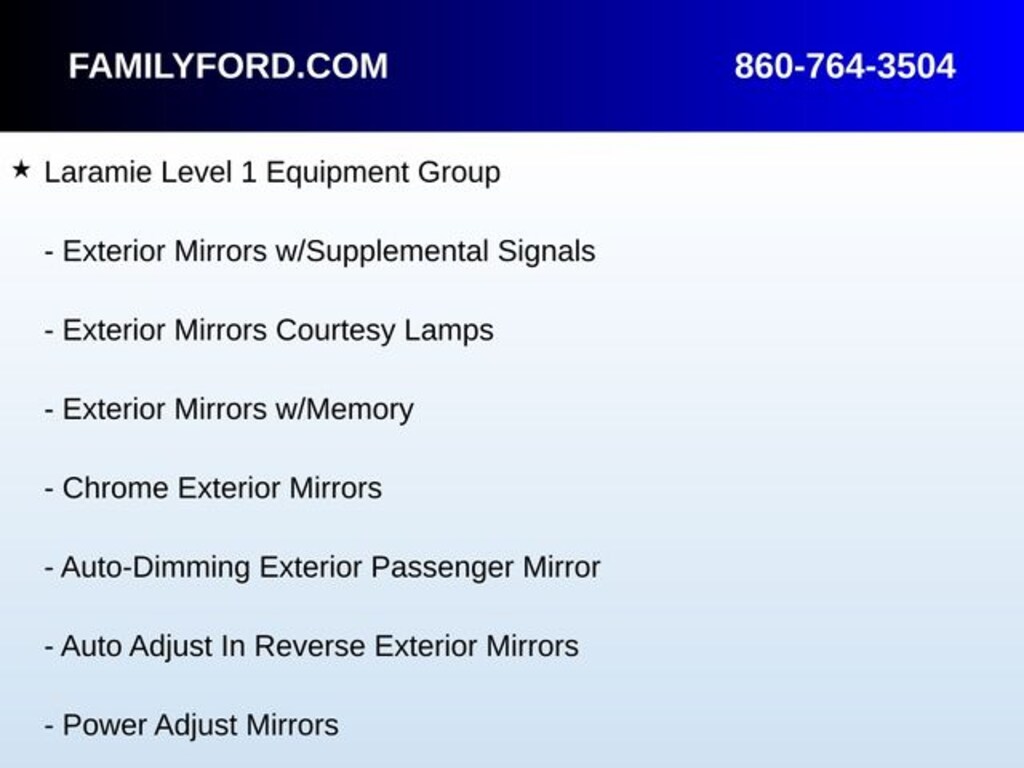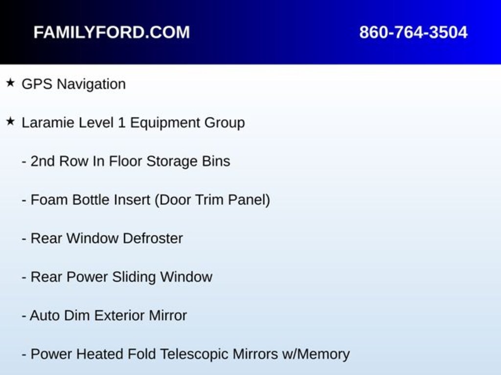 12" Touchscreen Display, 2nd Row In Floor Storage Bins, 4G LTE Wi-Fi Hot Spot, Alexa Built-In, Apple CarPlay, Apple CarPlay/Android Auto, Auto Adjust In Reverse Exterior Mirrors, Auto Dim Exterior Mirror, Auto High Beam Headlamp Control, Auto Power-Folding Mirrors, Auto-Dimming Exterior Passenger Mirror, Blind Spot & Cross Path Detection, Center Hub, Chrome Exterior Mirrors, Connected Travel & Traffic Services, Connectivity - US/Canada, Delay-off headlights, Disassociated Touchscreen Display, Exterior Mirrors Courtesy Lamps, Exterior Mirrors w/Heating Element, Exterior Mirrors w/Memory, Exterior Mirrors w/Supplemental Signals, Foam Bottle Insert (Door Trim Panel), For Details, Visit DriveUconnect.com, For More Info, Call 800-643-2112, Forward & Reverse Utility Lights, Front LED Fog Lamps, Fully automatic headlights, Global Telematics Box Module (TBM), Google Android Auto, GPS Antenna Input, GPS Navigation, HD Radio, Heated Front Seats, Integrated Voice Command w/Bluetooth, Laramie Level 1 Equipment Group, Leather Trim 40/20/40 Bench Seat, LED Reflector Headlamps, LED Tail Lamps, Mirror Running Lights, Off-Road Information Pages, Panic alarm, ParkSense Front/Rear Park Assist System, ParkView Rear Back-Up Camera, Power Adjust 8-Way Front Passenger Seat, Power Adjust Mirrors, Power Adjustable Convex Aux Mirrors, Power Adjustable Pedals w/Memory, Power Heated Fold Telescopic Mirrors w/Memory, Power Telescoping Mirrors, Radio: Uconnect 5 Nav w/12.0" Display, Rain Sensitive Windshield Wipers, Rear Power Sliding Window, Rear step bumper, Rear Window Defroster, Remote Tailgate Release, Security system, Selectable Tire Fill Alert, SiriusXM Radio Service, SiriusXM w/360L, Speed control, Trailer Tow Pages, Wheels: 18" x 8.0" Polished Aluminum.
